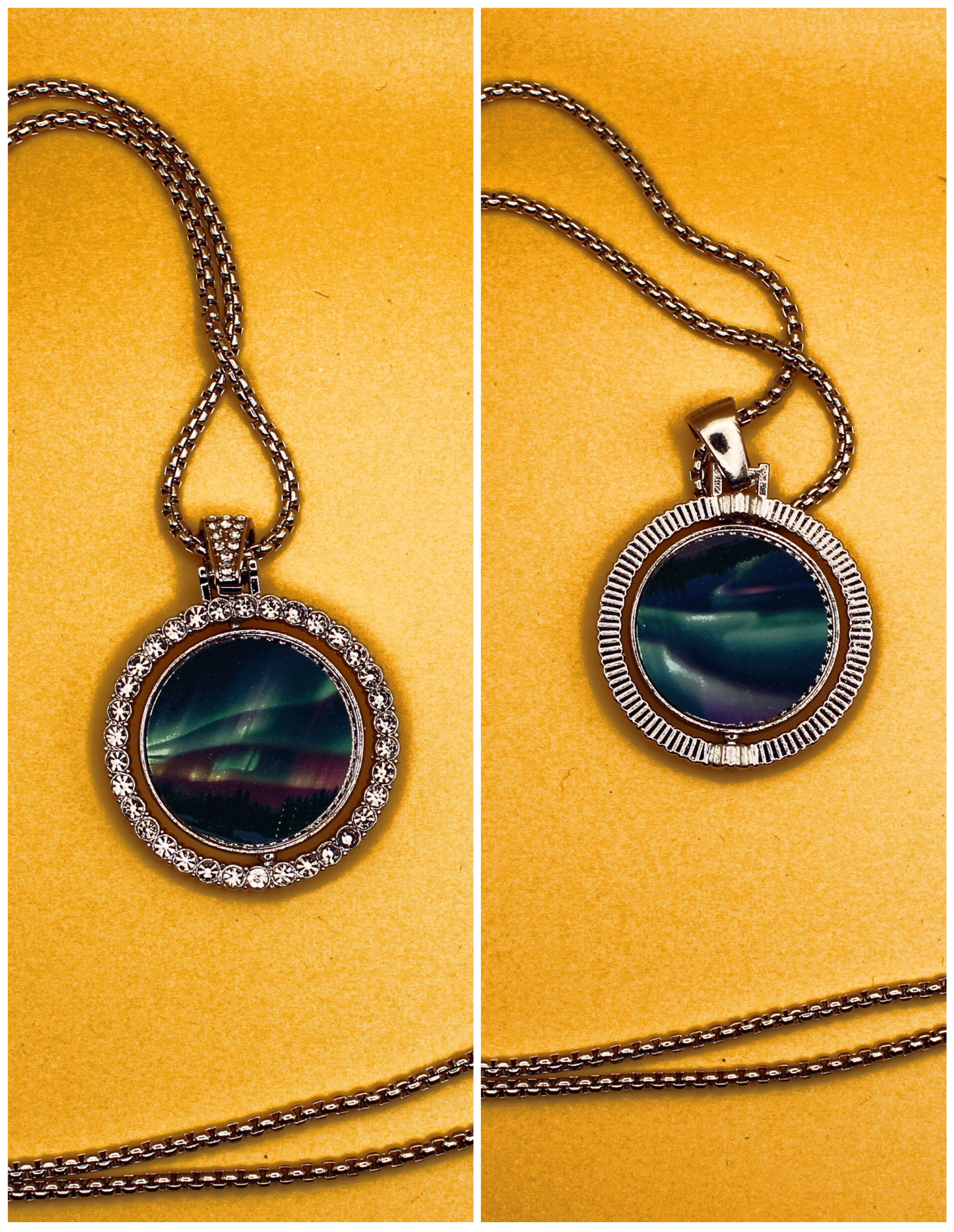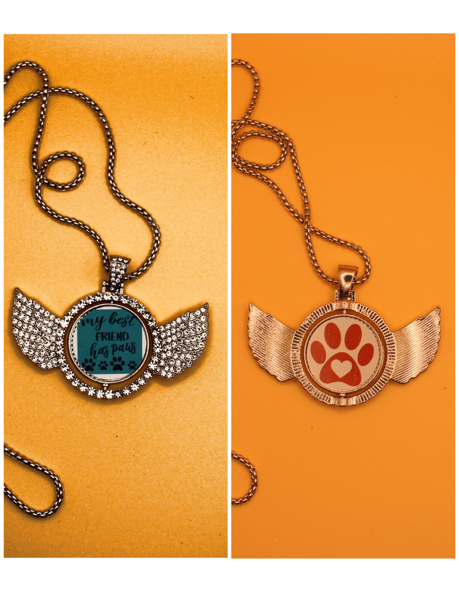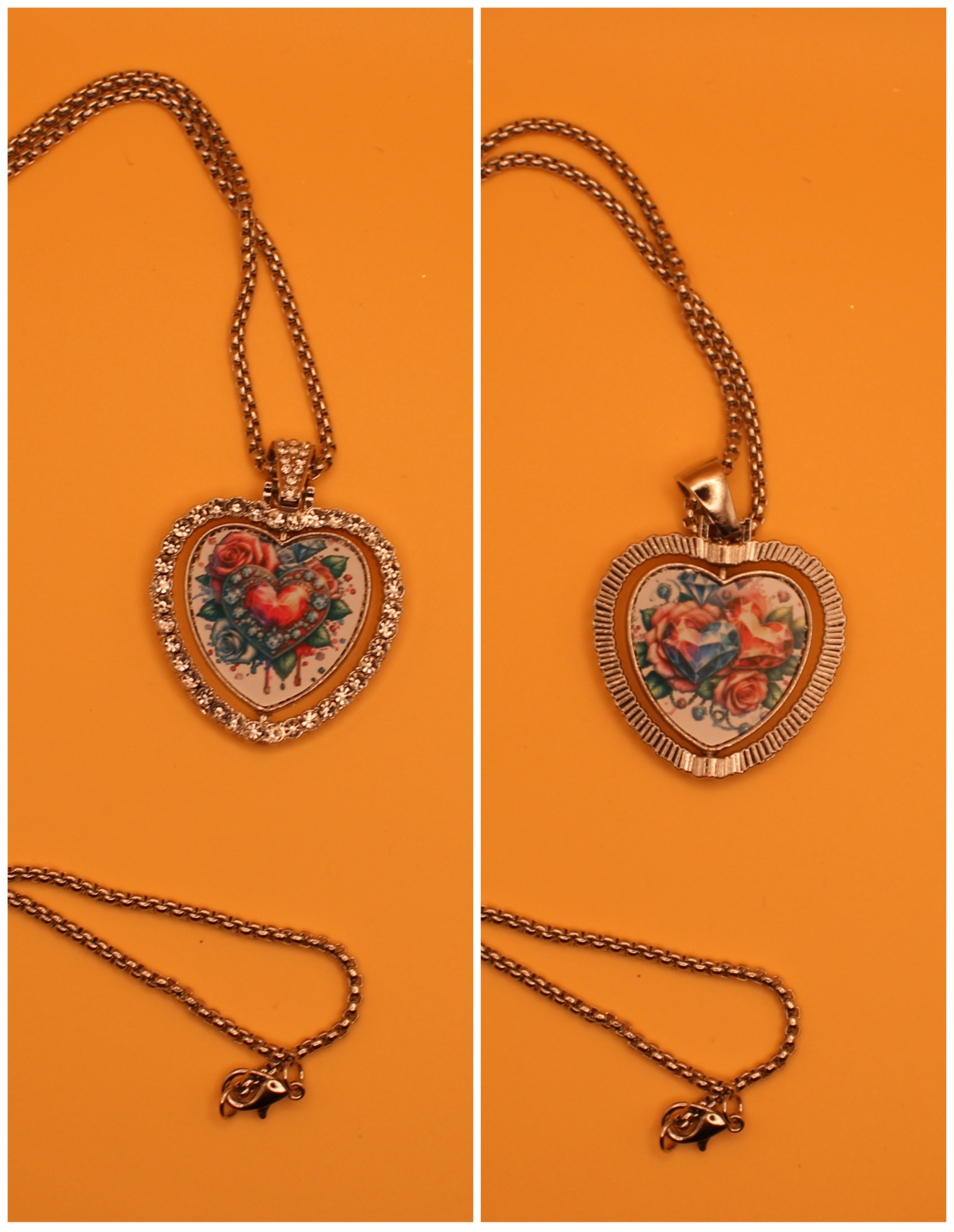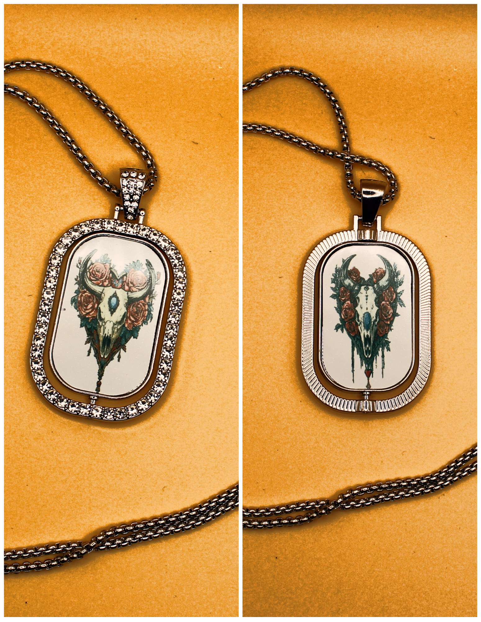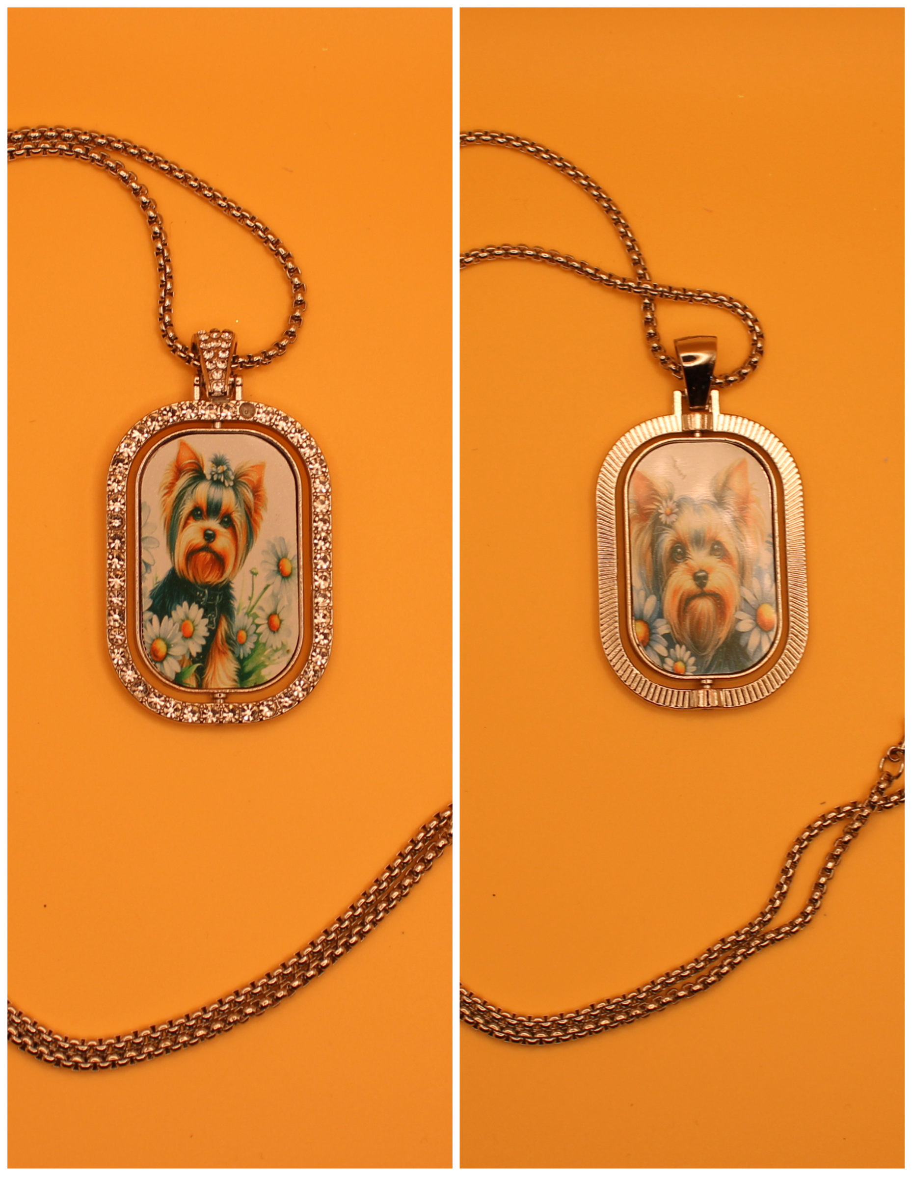 This versatile reversible necklace is like getting multiple looks in one piece. One side features a sleek, shiny metal finish, while the other sparkles with rhinestone embellishments. The center charm also swivels, revealing a different sublimated image on each side for even more styling options. Finished with a secure lobster-style clasp, it’s perfect for everyday wear or special occasions.