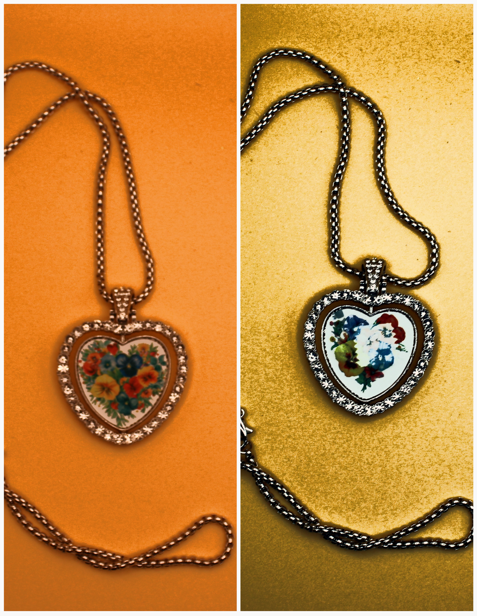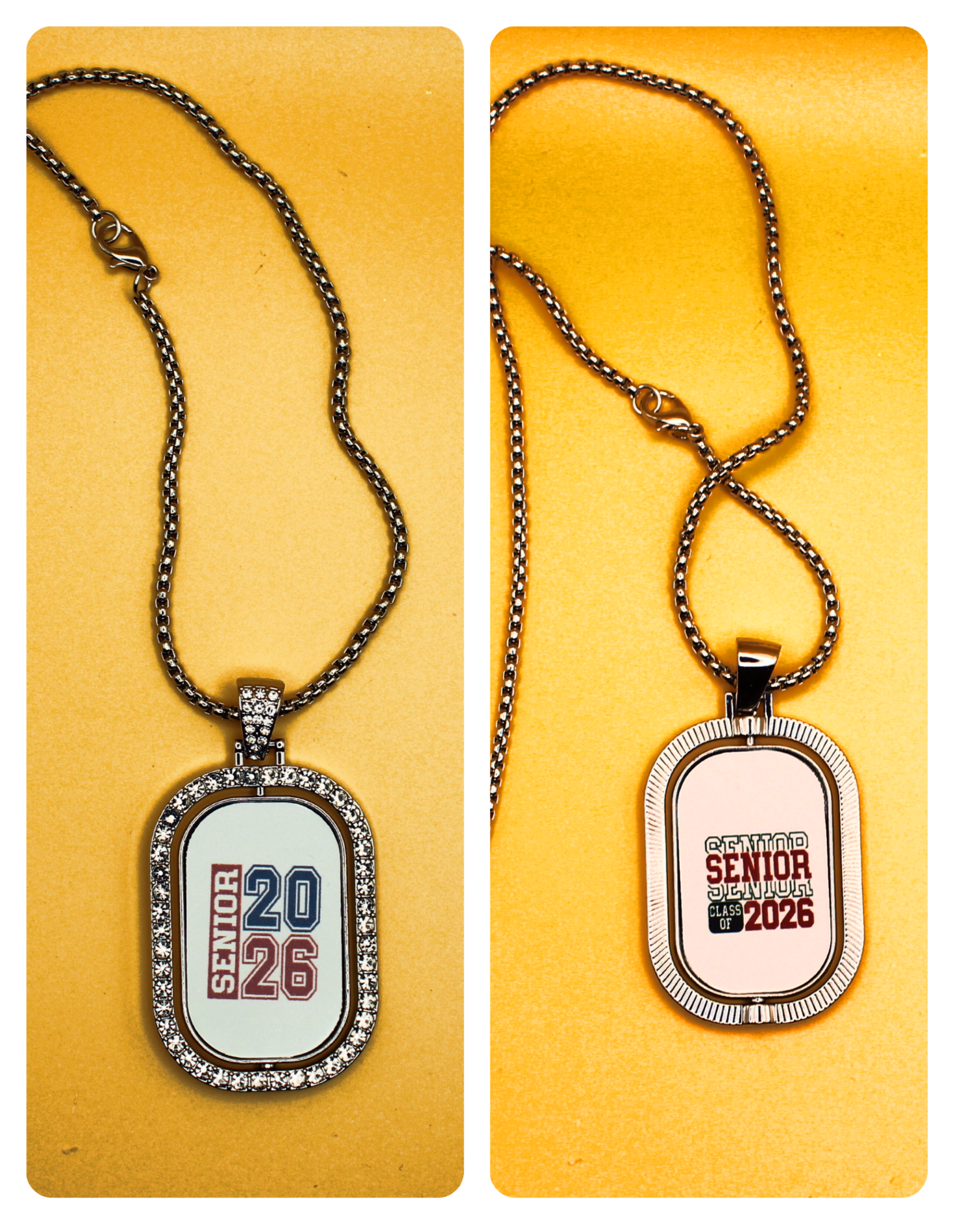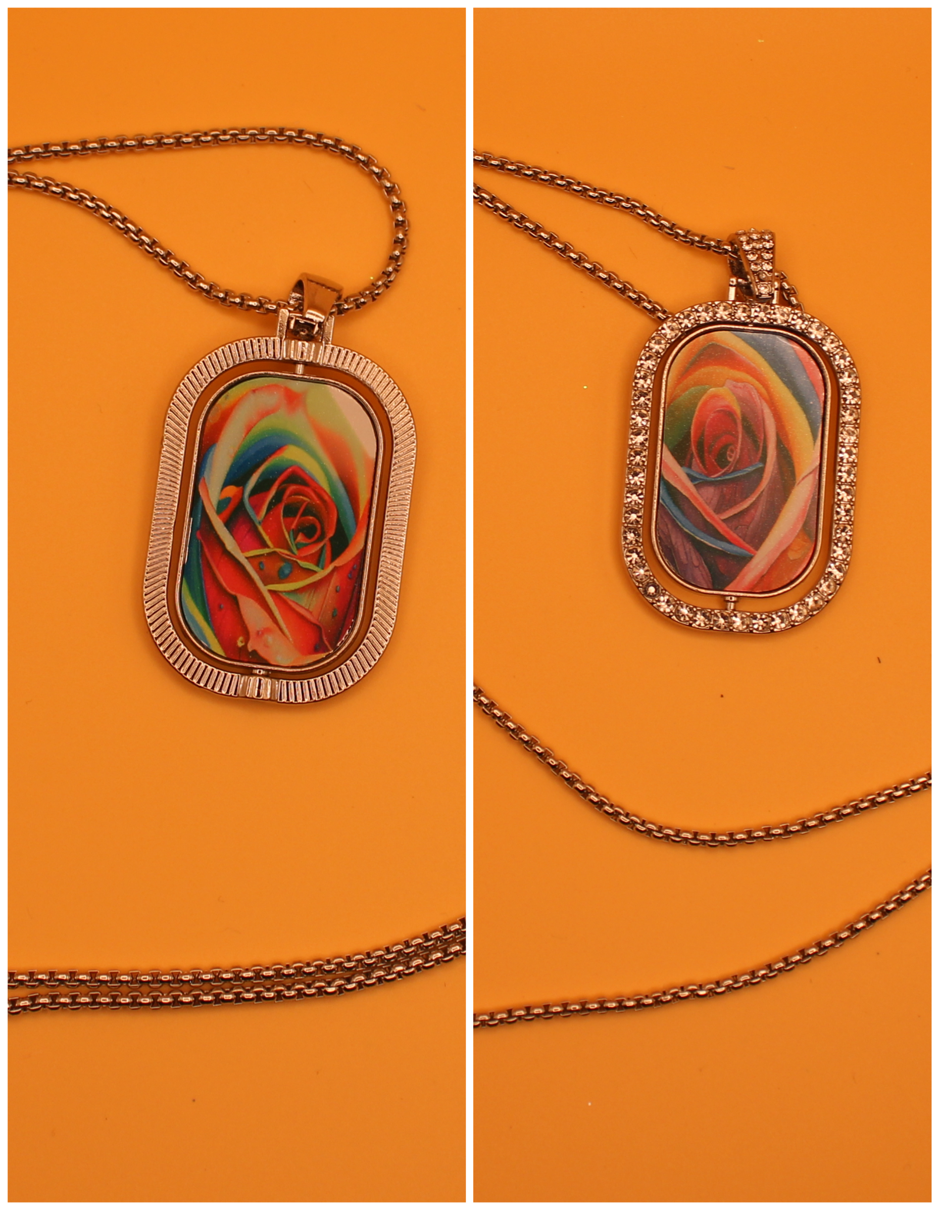 colorful images are sublimated onto the center portion of these reversible necklaces